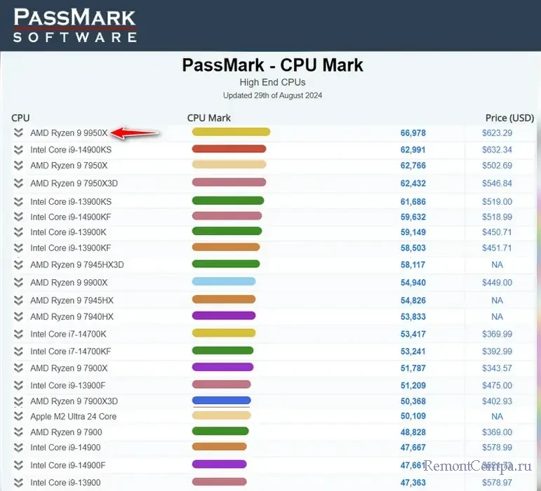 Оказаться на верхушке рейтинга недавно посчастливилось самому мощному представителю AMD Ryzen 9000-й серии. Но это рейтинг общей производительности, включающий тесты всех ядер и потоков. Соответственно, с лидерских позиций этого рейтинга представитель AMD Ryzen 9000-й серии вмиг исчезнет, как только будет убран фильтр десктопных процессоров, и в добавятся процессоры серверные и для рабочий станций с числом ядер от 32. Но обратим, друзья, внимание, на то, что самый мощный представитель Intel Core 14-го поколения дышит в спину самому мощному процессору AMD Ryzen 9000-й серии, при этом имея в 2 раза меньше производительных ядер и потоков.
