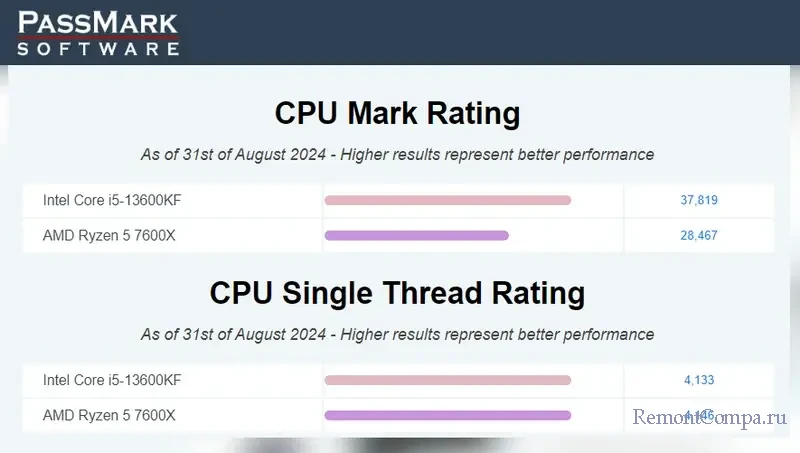 И, друзья, в конечном итоге выходит, что за выбор платформы Intel мы переплатим только 2,4 тыс. руб. В этом конкретном случае мы заплатим 2,4 тыс. руб. не только за все оговоренные выше преимущества платформы Intel, но и за мощь самого процессора. Так, обратимся снова к бенчмарк-тестам PassMark. У процессоров одинаковая производительность на ядро, при этом у Core i5-13600KF меньше частота ядра: 5,1 ГГц против 5,3 ГГц у Ryzen 5 7600X. Соответственно, будучи разогнанным до частоты 5,3 ГГц Core i5-13600KF будет мощнее. В общей производительности Core i5-13600KF сильнее противника на 33%. Поскольку имеет не только 6 производительных ядер и 12 потоков, как Ryzen 5 7600X, но ещё и 8 энергоэффективных ядер, которые при нагрузках возьмут на себя обработку простых задач, оставив ресурс производительных ядер для серьёзных задач.