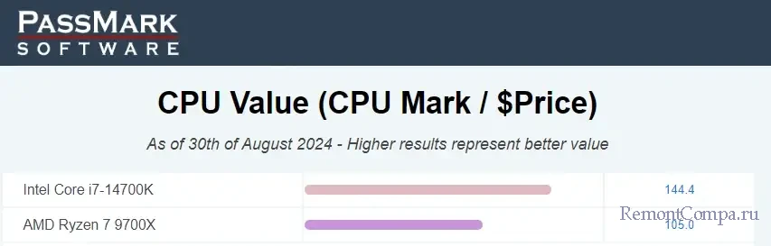 Всё это батлы процессорных монстров, нужных далеко не в каждой игровой или просто производительной системе. Давайте сравним в производительности оптимальные процессоры для мощного современного ПК, в частности, игрового. В батле самых мощных представителей AMD Ryzen 7 9000-й серии и Intel Core i7 14-го поколения последний выигрывает безоговорочно. У процессоров примерно одинаковые баллы производительности на ядро, различия на уровне погрешности. Но Core i7, имея столько же производительных ядер, что и Ryzen 7 – 8, имея столько же потоков – 16, предусматривает дополнительно 12 энергоэффективных ядер и 12 их потоков. Что даёт Core i7 более чем 40%-ный выигрыш в общей производительности.