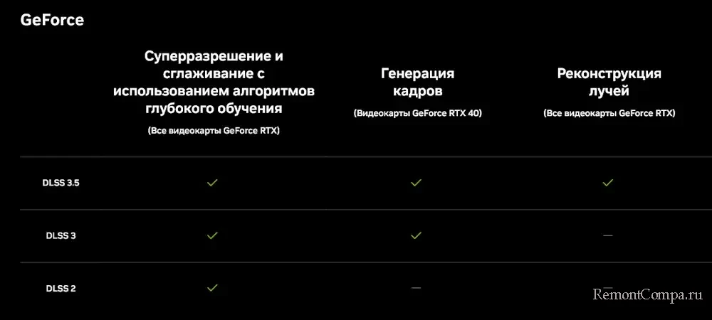 Какое-то время DLSS 3.0 была доступна только для видеокарт GeForce серии RTX 40. С выходом DLSS 3.5 эта версия технологии стала доступной для всех видеокарт GeForce RTX, за исключением функции Frame Generation, эксклюзивной для RTX 40-й серии.