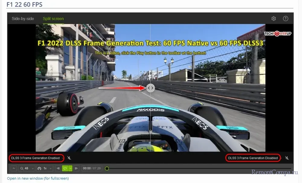 И здесь нашему обозрению будут представлены сравнительные видео различных современных игр с разным или одинаковым FPS, но главное - с включённой DLSS и без неё. Видео наложены друг на друга, перетягиванием ползунка на видео можно увеличивать или уменьшать область того или иного видеоряда и сравнивать их. Видео можно масштабировать, ускорять, развернуть на весь экран. Это реально годная фишка этого сервиса, позволяющая визуально оценить разницу в качестве изображения с DLSS и без неё.
