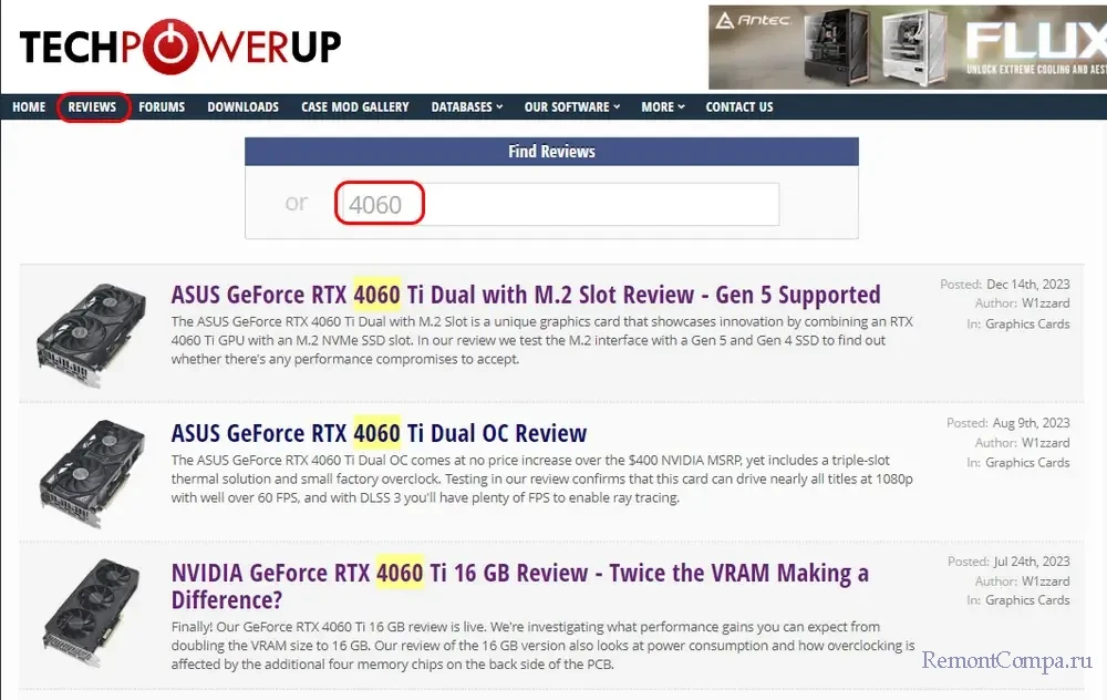 Как работает технология DLSS, можно увидеть в различных обзорах игр или самой технологии на видеохостингах в Интернете. Но есть способ исследовать DLSS тщательнейшим образом – в обзорах видеокарт сервиса TechPowerUp. На сайте сервиса в разделе обзоров «Review» вводим в поиск модели различных видеокарт, предпочтительно GeForce RTX 40.