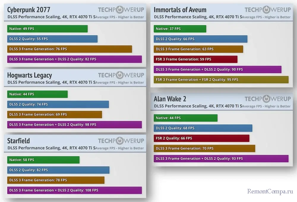 Обратимся снова к сервису TechPowerUp. И посмотрим, например, тесты видеокарты GeForce RTX 4070 Ti Super (в реализации MSI GeForce RTX 4070 Ti Super Ventus 3X). В числе тестов есть сравнения среднего FPS в некоторых требовательных играх в 4К на максимальных настройках. Зелёным маркером отмечены нативные результаты, эта видеокарта не вытягивает 60 FPS. Другими маркерами обозначен средний FPS, зафиксированный при включении разных технологий апскейлинга – DLSS и FSR - и разных их конфигураций. Результаты тестов показывают, что эта видеокарта выдаст больше 60 FPS при задействовании одной лишь функции Frame Generation (отмечено коричневым маркером). А при включении и DLSS с ориентацией на качество, и функции Frame Generation мы получим очень хороший прирост производительности (отмечено сиреневым маркером).