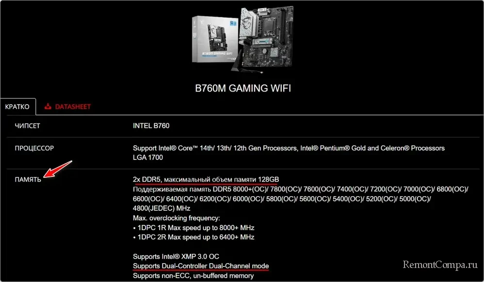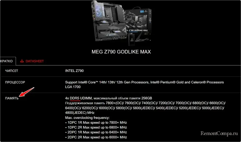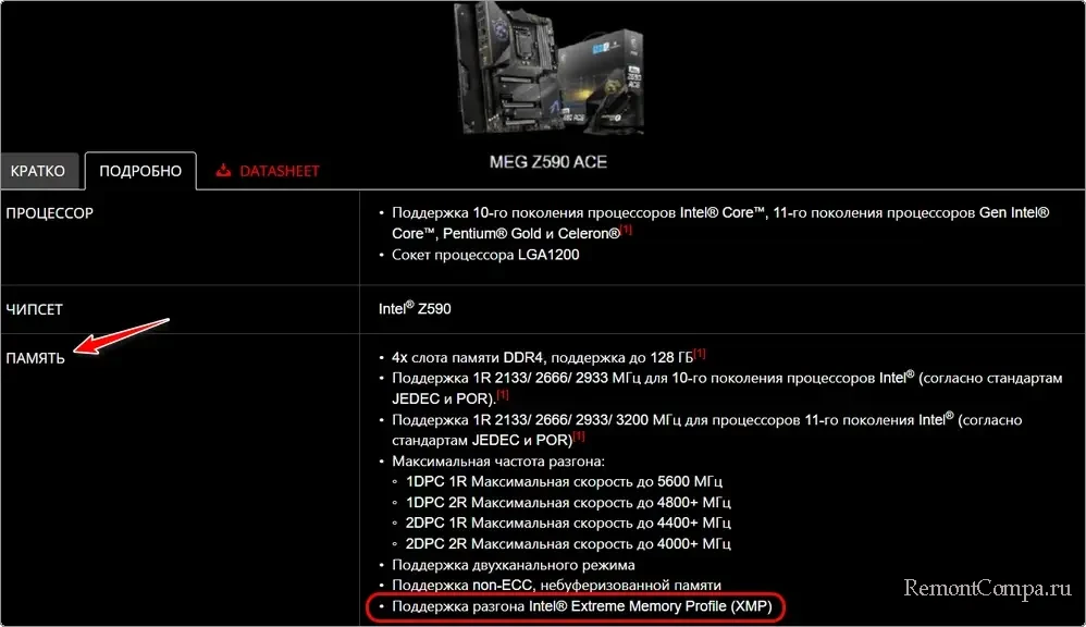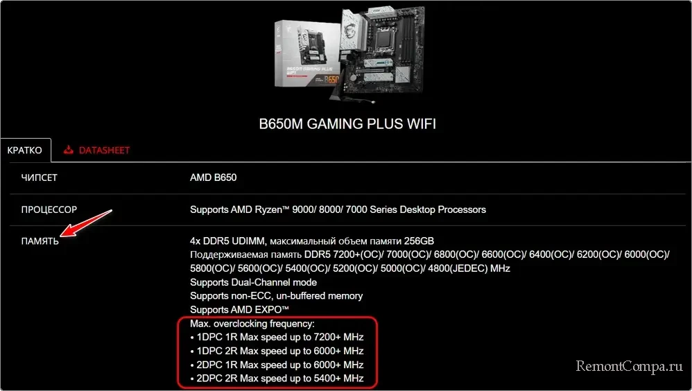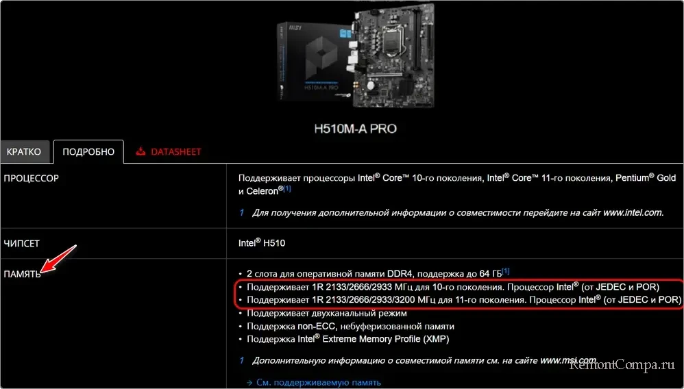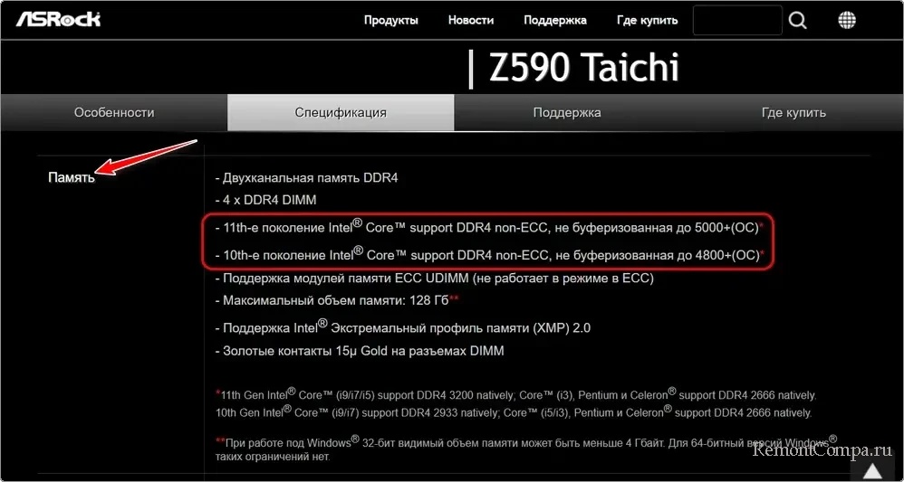 Поддерживаемое поколение памяти DDR, а также прочие нюансы, касаемые оперативной памяти – всё это указывается в спецификациях платы на сайте производителя.