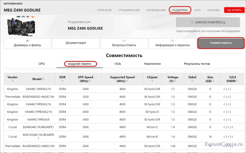 В этом перечне будут протестированные производителем планки памяти, насчёт которых он уверен, что они запустятся. Может быть так, что в этом перечне не будет продуктов, ориентированных на рынки отдельных стран. В таком случае можно сопоставить память конкретных производителей по характеристикам в соответствии с той, что имеется на рынке своей страны.