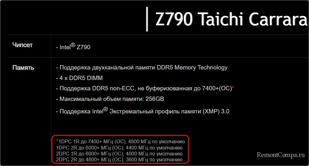 Но даже без разгона двухранговая память может давать просадку и не достигать частот, заявленных процессором или стоковых самих планок, если используется двухканальный режим, а тем более если установлено 4 планки памяти. Давайте посмотрим нюансы работы оперативной памяти DDR5, оговоренные в спецификациях материнской платы под Intel-платформу на максимальном Z-чипсете. Обратим внимание на вот это.