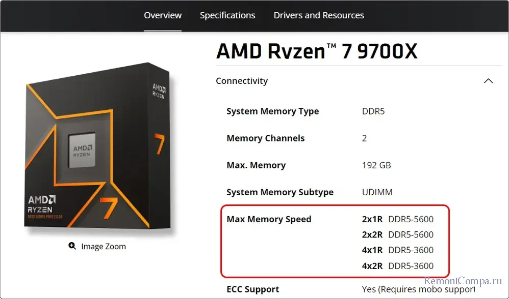 Тогда как компания Intel об этих тонкостях работы оперативной памяти DDR5 в спецификациях своих процессоров умалчивает, компания AMD честно заявляет, что её процессоры с поддержкой DDR5 будут работать с этой памятью на стоковой частоте 5200 или 5600 МГц (в зависимости от серии) при условии установки только 2-х планок одноранговой или двухранговой памяти. При установке же любых 4-х планок стоковая частота памяти будет сброшена до 3600 МГц.