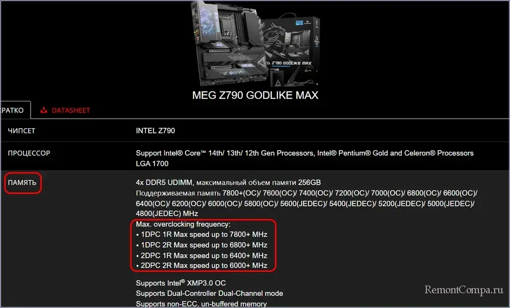 Так, в спецификациях материнских плат, в характеристиках оперативной памяти можем видеть перечень частот, до которых её можно разогнать, часто они обозначаются как (ОС), т.е. Overclocking. Но также можем видеть ограничения в плане разгона: