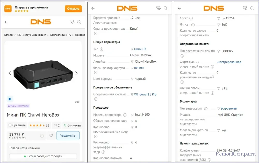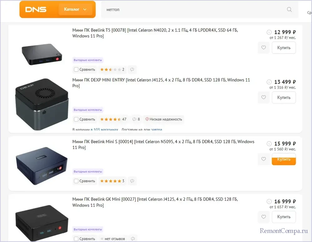 Более-менее пригодный к рассмотрению вариант – неттоп на базе 4-ядерного процессора Intel N100, выпущенный в 2023 году, с максимальной частотой 3,4 ГГц и оперативной памятью 8 Гб. Он комплектуется SSD SATA всего лишь на 256 Гб. И за такое устройство придётся выложить 19 тыс. руб.