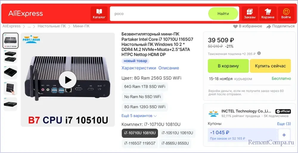 Более-менее пригодный к рассмотрению неттоп попался на рубеже 40 тыс. руб. За эту цену получаем процессор 10-го поколения Intel Core i7-10710U, выпущенный 2019 года, 12 ядер, 6 потоков, максимальная частота 4,7 ГГц. А также 8 Гб оперативной памяти и SSD NVMe на 256 Гб. Нужен или процессор уровня Intel Core i7 в неттопе – вопрос спорный.