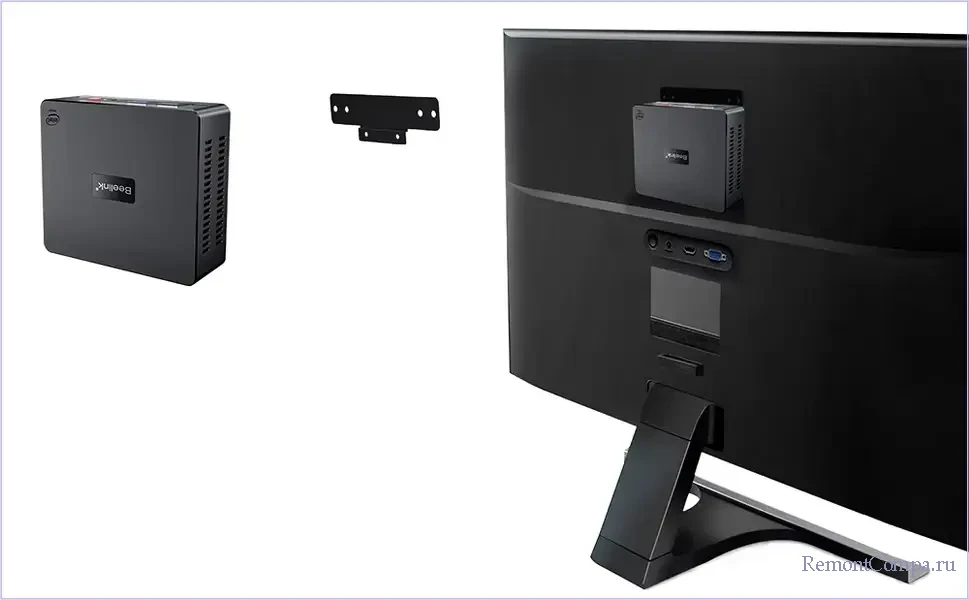 А можно прикрепить к задней стенке монитора, по сути, превратив монитор и неттоп в моноблок.