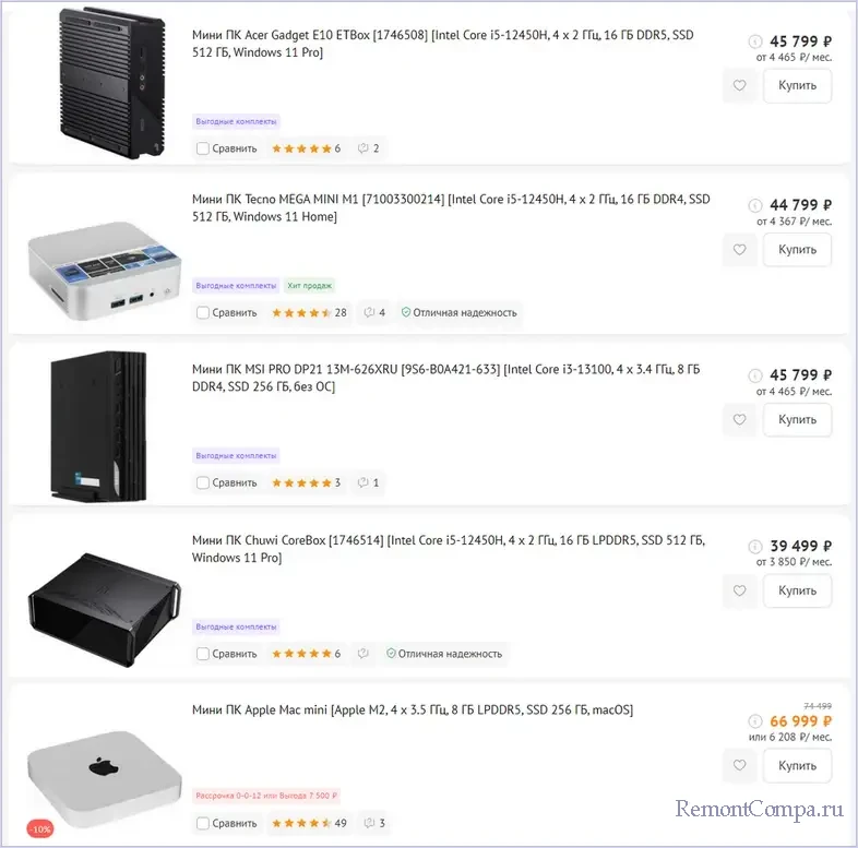 Неттоп на базе современных производительных процессоров Intel Core i3 и i5 12-го и 13-го поколения обойдётся от 40 тыс. руб. А за Apple Mac mini придётся выложить от 70 тыс. руб.