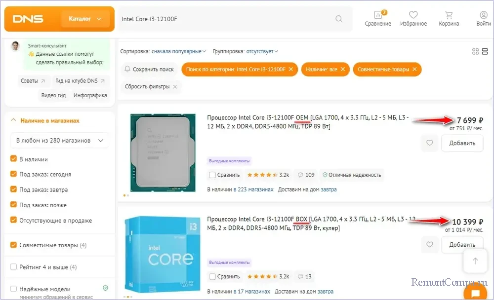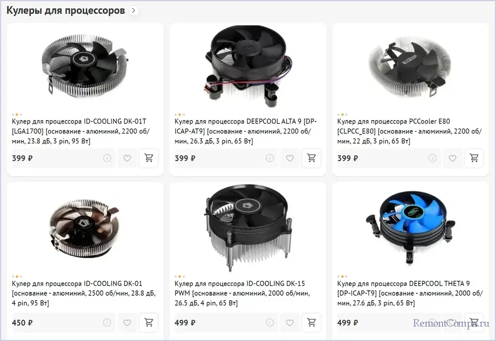 Родные кулеры процессоров, как правило, идут с небольшой рассеиваемой мощностью – 65-95 Вт. Это охлаждение начального уровня, для процессоров максимум усреднённой производительности, с базовым TDP до 65 Вт. Но, друзья, такое охлаждение в BOX-комплекции может стоить баснословных денег. Вот на скриншоте ниже пример, как один и тот же процессор в разных комплектациях имеет разную цену. При этом в BOX-комплектации с кулером он дороже на 2700 руб.