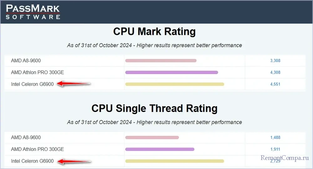 Определённо можно сказать, что Intel длительное время опережает AMD в нише самых производительных десктопных процессоров. И что Intel сейчас является, по сути, единственным решением в ультрабюджетной нише процессоров. На которую компания AMD забила, выпустив последние недорогие процессоры Athlon Silver и Gold аж в 2020 году. Так, друзья, если перед нами будет стоять задача выбрать очень дешёвый процессор, скажем, в рамках бюджета 5 тыс. руб., то в числе лучшего, что будет на столь малую сумму – это 4-ядерный AMD A8-9600 2017 года выпуска, 2-ядерный и 4-поточный AMD Athlon PRO 300GE 2019 года выпуска и просто 2-ядерный Intel Celeron G6900 2022 года выпуска. У всех троих максимальная частота ядра 3,4 ГГц. Из всех их самым производительным будет самый молодой Intel Celeron G6900. Он настолько эффективен в однопоточной производительности, что, как показывают тесты бенчмарка PassMark, опережает конкурентов от AMD, даже не имея 4-х ядер и потоков.
