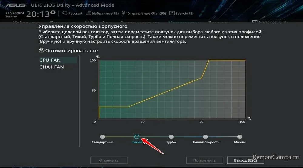 После снижения оборотов кулеров необходимо отследить температуру аппаратных устройств компьютера в условиях запуска типичных наших задач, чтобы либо убедиться, чтобы оборотов достаточно для охлаждения, либо немного увеличить обороты или установить другой профиль.