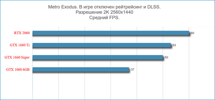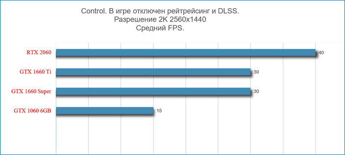 Control — третья игра, которая поможет нам сравнить видюхи. Игра достаточно новая и имеет поддержку лучей и DLSS, которые мы также отключим на время тестов. GeForce GTX 1060 выдаёт нам в среднем около 30 кадров в разрешении 1080p. При выборе 2К-разрешения мы уже наблюдаем нестабильный FPS равный 15 кадрам. Карточка GTX 1660 Super в FullHD справляется гораздо лучше и выдаёт уже 45 — 47 кадров, в то время когда в 2К можно играть только с 30 кадрами. Версия TI в этой игре показывает нам такой же результат, как и Super, причём в обоих разрешениях. RTX 2060, как обычно, лидирует и показывает фреймрейт в 58 — 59 кадров при FullHD. В 2К игра идёт с показателями в 37 — 40 FPS.