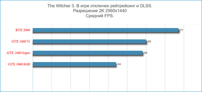 Второй игрой возьмём The Witcher 3. Хоть и довольно старая, но до сих пор требовательная игра. Младшая GTX 1060 показывает в среднем 52 — 54 кадра в секунду в разрешении FullHD, в 2К выходит 44 — 45 кадров. С карточкой 1660 Super в разрешении 1080p мы уже можем наблюдать около 68 — 70 кадров, в 2К фреймрейт равен 58 — 60 кадрам. TI версия GTX 1660 также имеет прирост в пару кадров и имеет средний FPS равный 71 — 72 в 1080. В 2К-разрешении будем иметь стабильные 60 кадров. Далее запускаем Ведьмак 3 с нашей GeForce RTX 2060 в FullHD и видим в среднем 87 — 89 кадров в секунду, при том что в 2К можно наблюдать результат в 75 — 77 кадров.